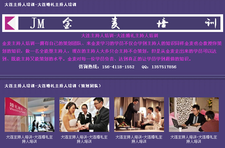 大連婚禮主持人培訓(xùn)、大連婚禮司儀培訓(xùn)、大連婚慶主持人培訓(xùn)、大連婚慶司儀培訓(xùn)、大連婚禮策劃師培訓(xùn)、大連主持人培訓(xùn)大連金麥主持人培訓(xùn)機(jī)構(gòu)專為2015年想成為主持人的朋友特設(shè)的一們課程,致力于培養(yǎng)更多的優(yōu)秀主持人,讓每一個(gè)想上舞臺的朋友都能實(shí)現(xiàn)夢想,在這里,我們圓你“主持人”的夢!機(jī)會就在這里,不要錯(cuò)過了!成功從這里起航??!