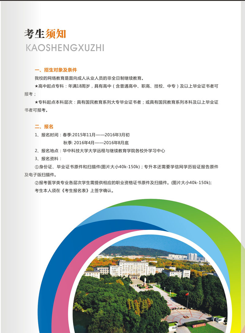 2016年華中科技大學(xué)網(wǎng)絡(luò)教育招生簡章介紹如下: