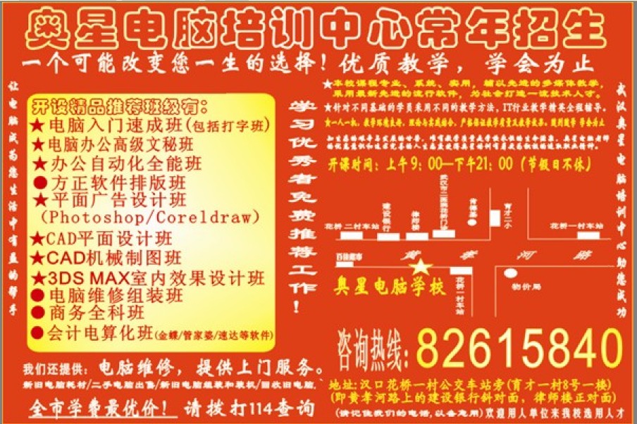 電腦培訓(xùn),武漢電腦培訓(xùn),漢口電腦培訓(xùn)中心。奧星電腦培訓(xùn)名牌學(xué)校連鎖店育才分店!武漢奧星電腦培訓(xùn)助您成功!專業(yè)的電腦培訓(xùn),十年的辦學(xué)經(jīng)驗(yàn),優(yōu)質(zhì)教學(xué)!隨到隨學(xué),學(xué)會(huì)為止!開(kāi)設(shè)有辦公自動(dòng)化、從零開(kāi)始o(jì)ffices辦公應(yīng)用全能班,入門(mén)班,初級(jí)文秘,高級(jí)文秘班等電腦基礎(chǔ)操作課程,讓您快速電腦入門(mén),開(kāi)設(shè)有圖像處理photoshop,平面設(shè)計(jì)coreldraw. cad設(shè)計(jì) 機(jī)械cad設(shè)計(jì);