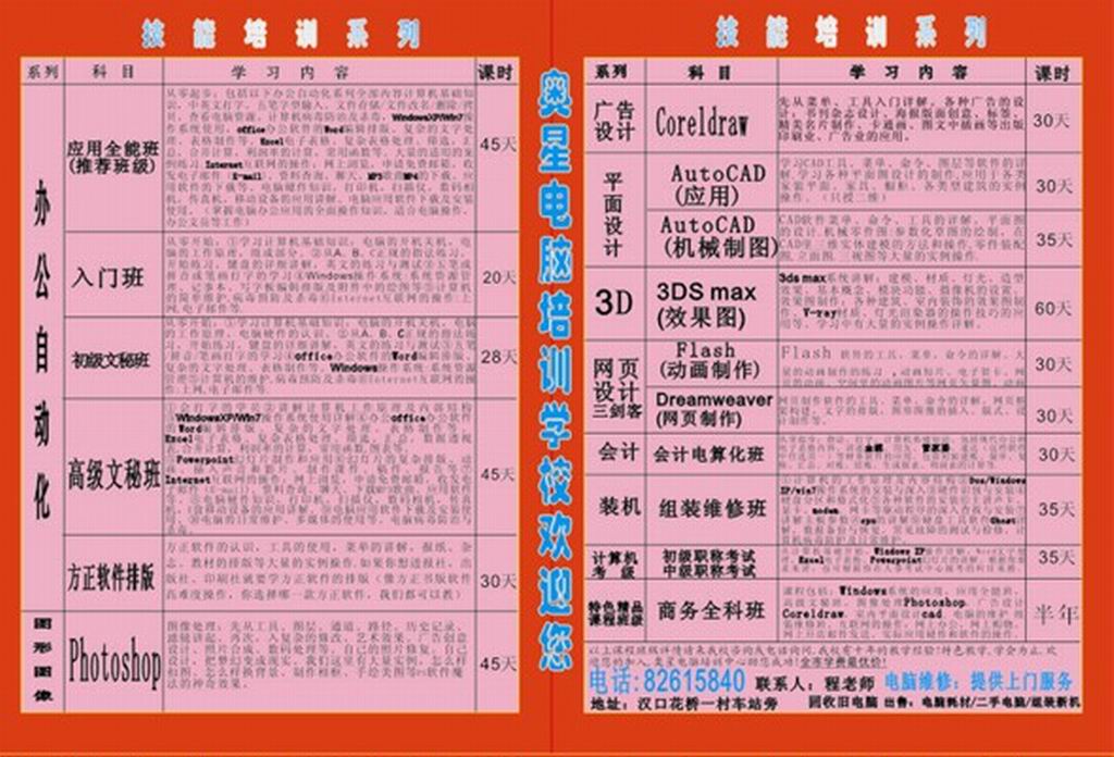 辦公高級(jí)文秘,方正軟件排版,3DS max V-ray效果圖制作,網(wǎng)頁(yè)設(shè)計(jì)三劍客全科班,技能培訓(xùn)等級(jí)考試班,會(huì)計(jì)電算化班,電腦組裝和維修等精品班,歡迎您來(lái)奧星電腦培訓(xùn)學(xué)校?。ㄩ_(kāi)設(shè)有白班和夜班)