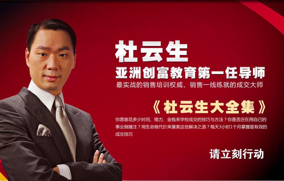 杜云生公眾演講:口才培訓(xùn)班、幫助1億人學(xué)會(huì)公眾演講! 把話說(shuō)出去把錢收回來(lái)!助您精通:演講稿如何寫(xiě)?口才訓(xùn)練方法、公眾演說(shuō)技巧、贈(zèng)送2013年最新杜云生演講視頻!公眾演說(shuō)能力,從一無(wú)所有的窮小子變成了億萬(wàn)富翁,從默默無(wú)聞的平凡人變成了全國(guó)聞名的演說(shuō)家,不但改變了自己和家族的命運(yùn),更是激勵(lì)無(wú)數(shù)的學(xué)員過(guò)上了自己渴望的生活。我相信我絕對(duì)有能力教會(huì)你用演說(shuō)改變命運(yùn)!